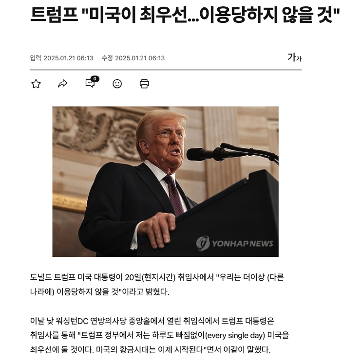 미국 트럼프 대통령의 취임식이 진행되었고, 연설이 있었는데요.